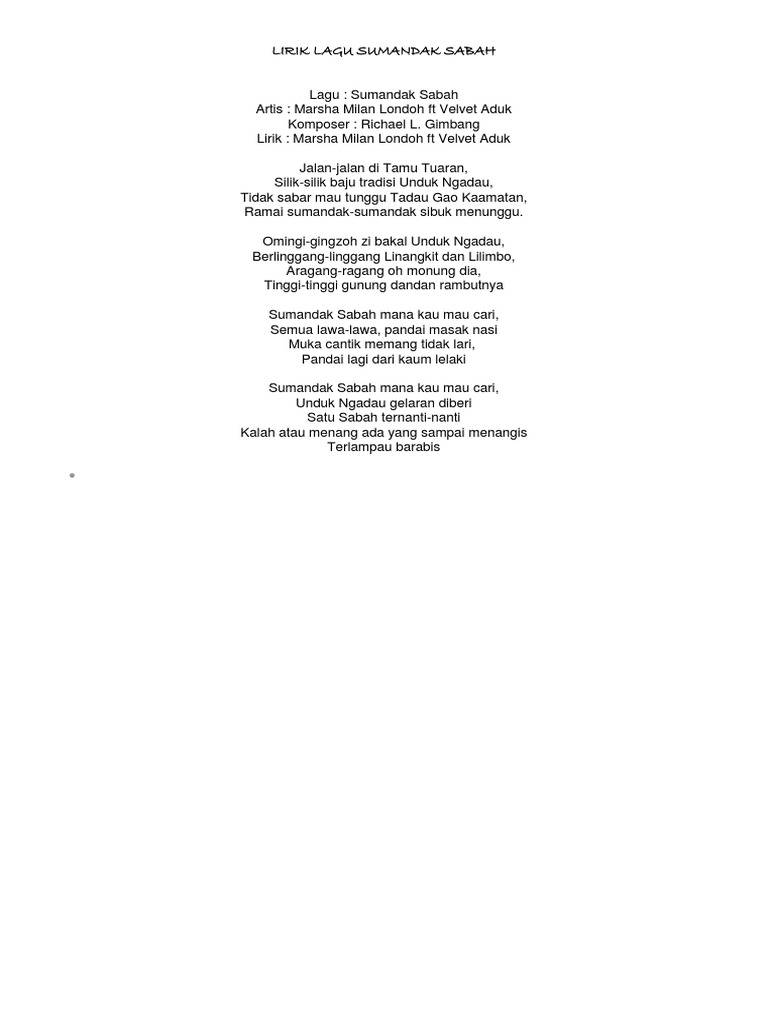 Lirik Lagu Dayak Sumandak Sabah Oleh Marsha Milan Velvet Aduk. Kalah atau menang ada yang sampai menangis. Lirik Sumandak Sabah - Marsha Milan Velvet Aduk jalan jalan di tamu tuaran.